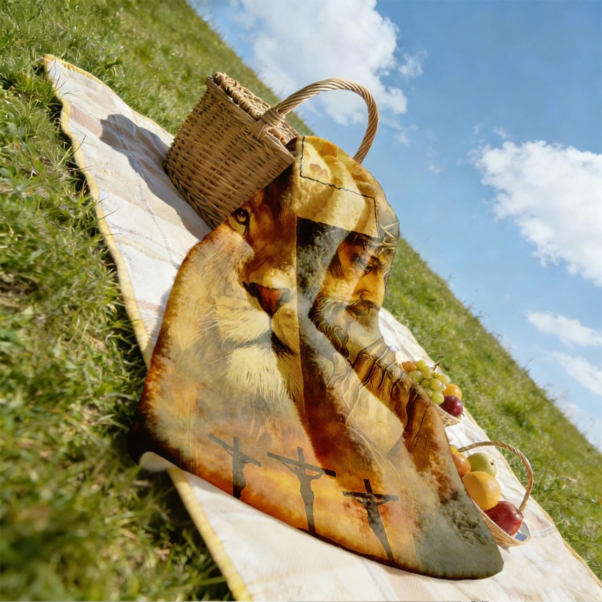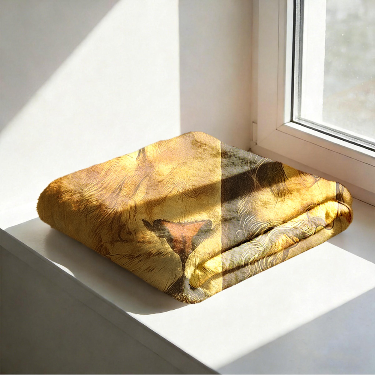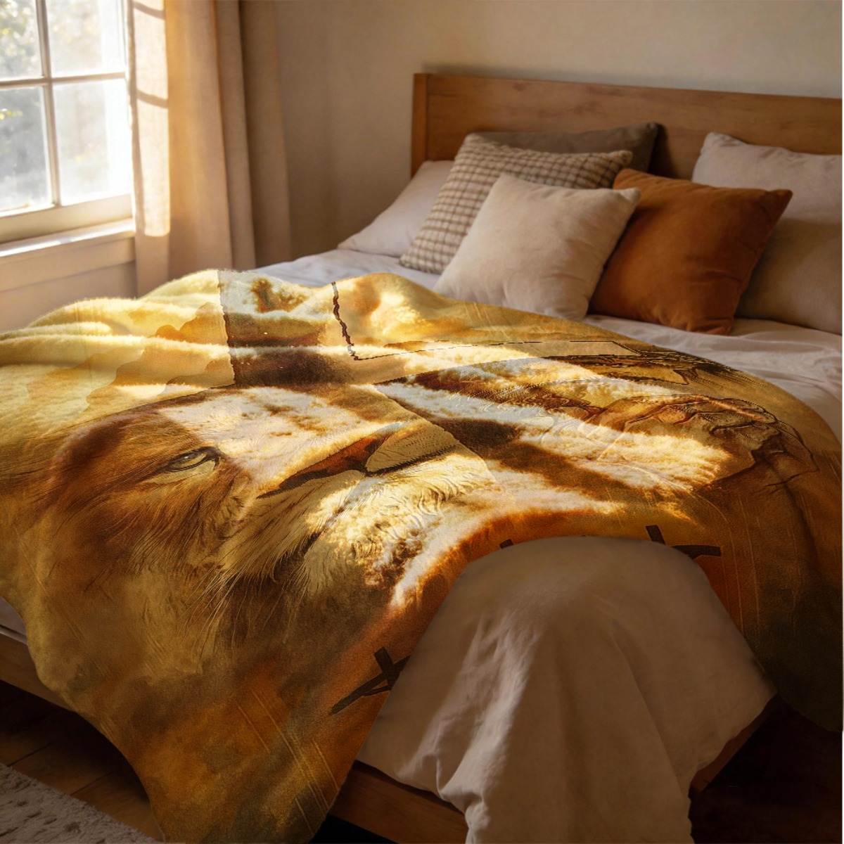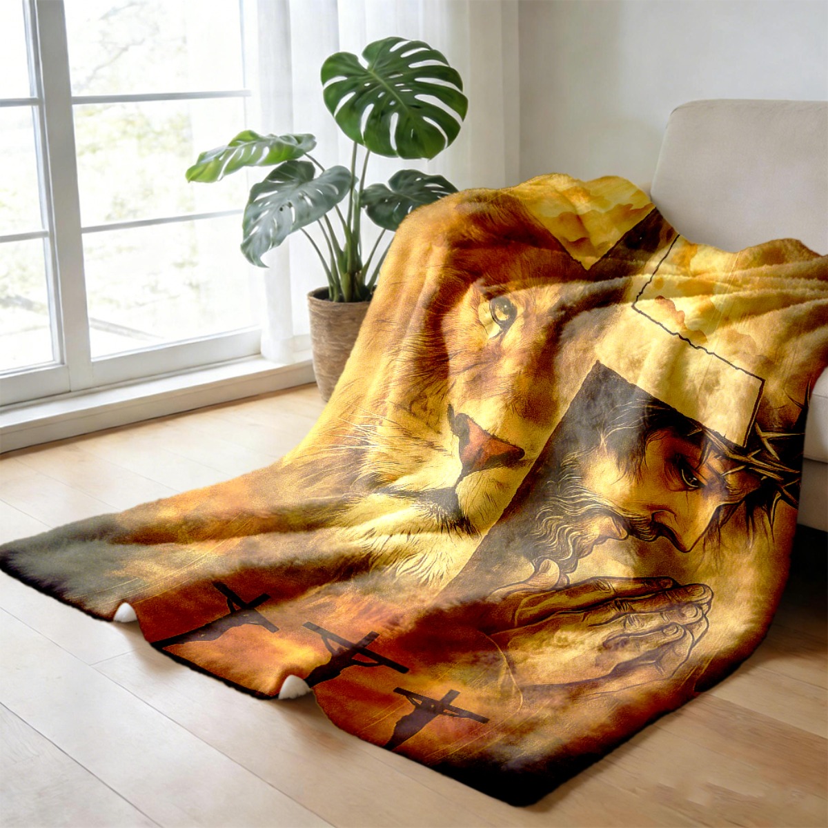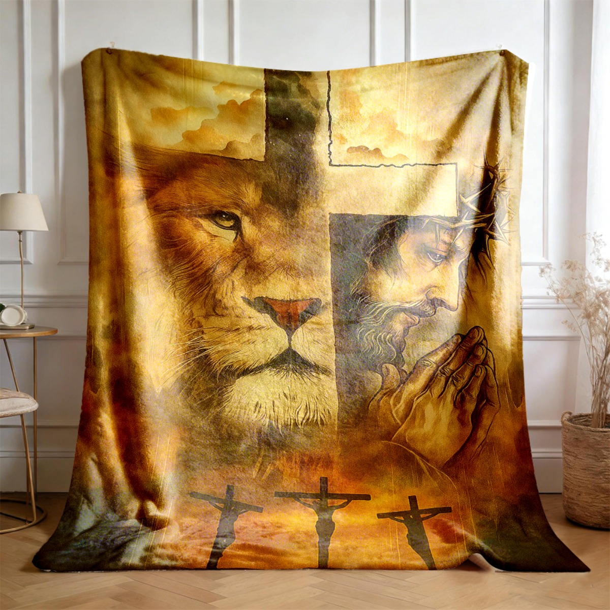 1pc French Christ Lion & Christian Cross Flannel Blanket - Soft Warm Religious B
