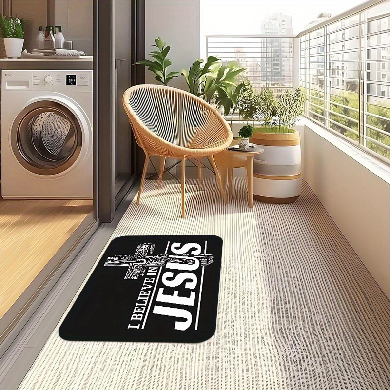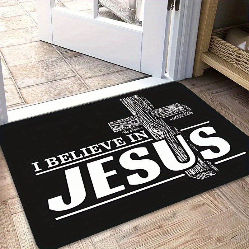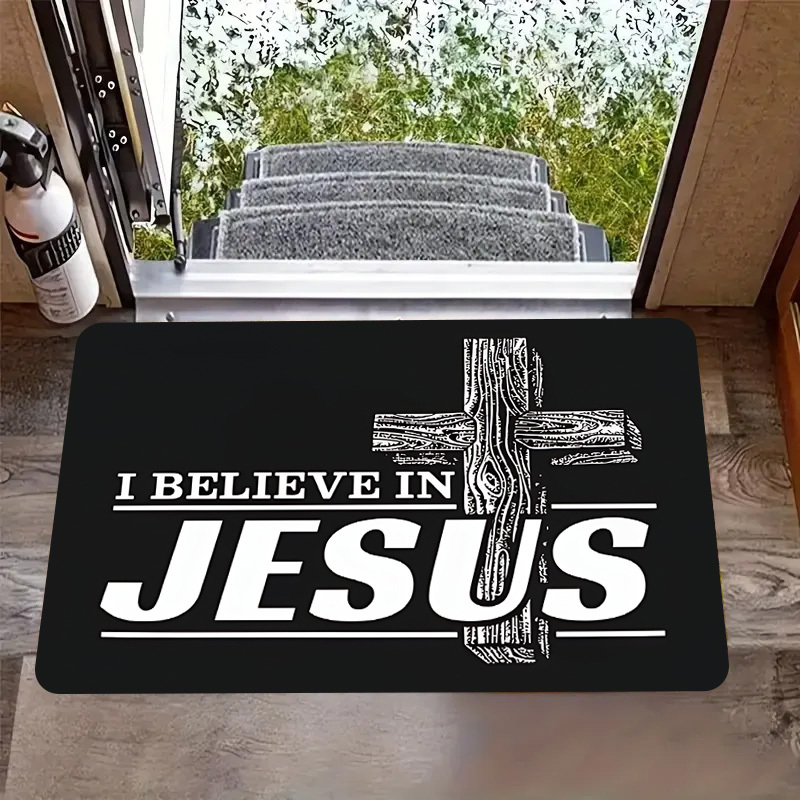 1pc Religious Outdoor Door Mat - "I Believe in " Design with Cross, Black with W