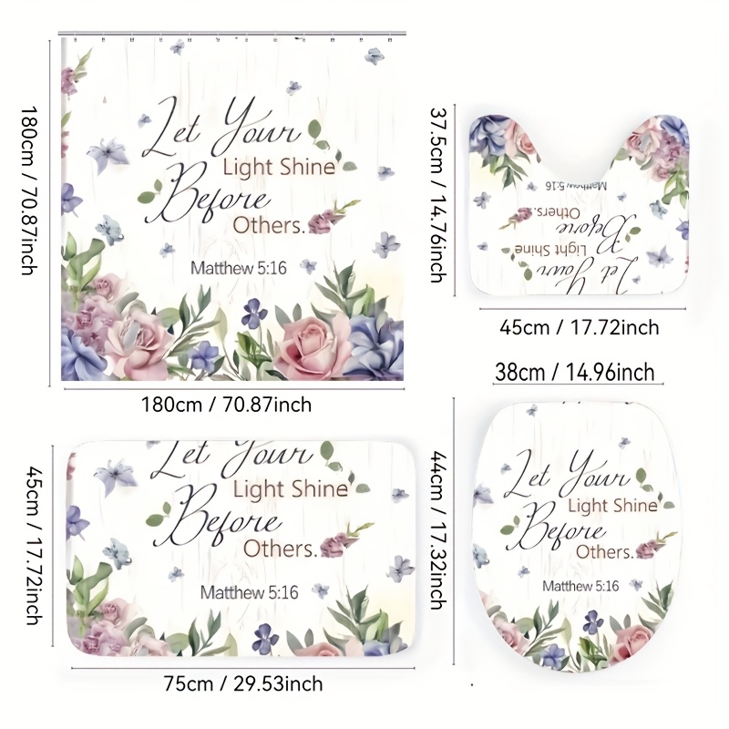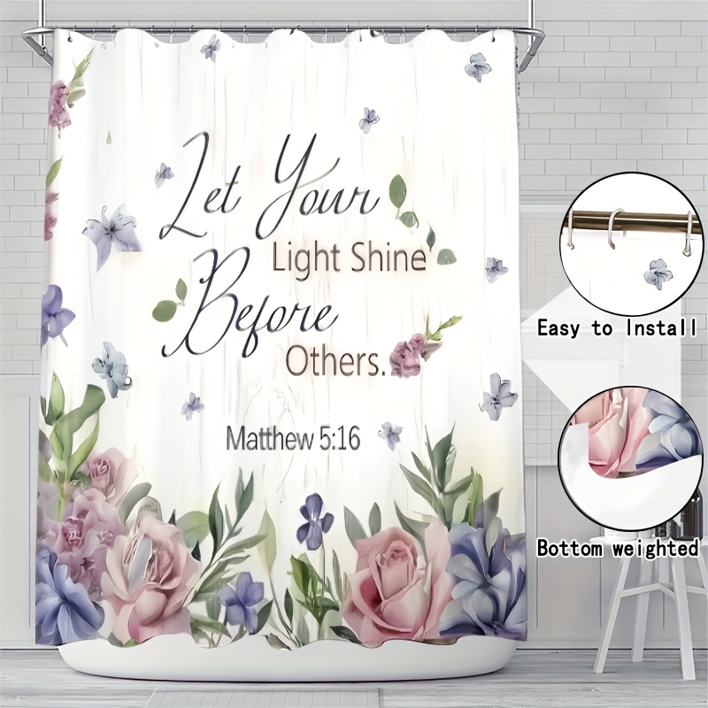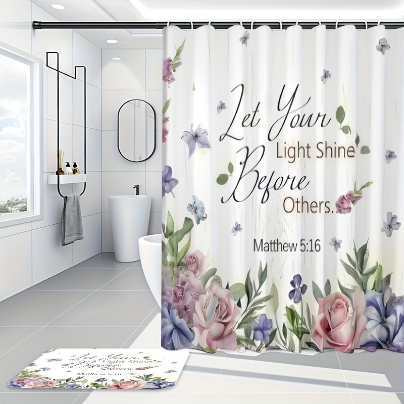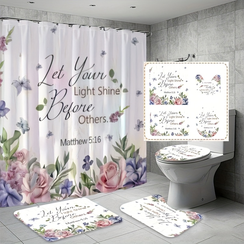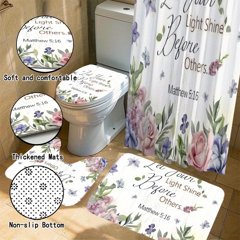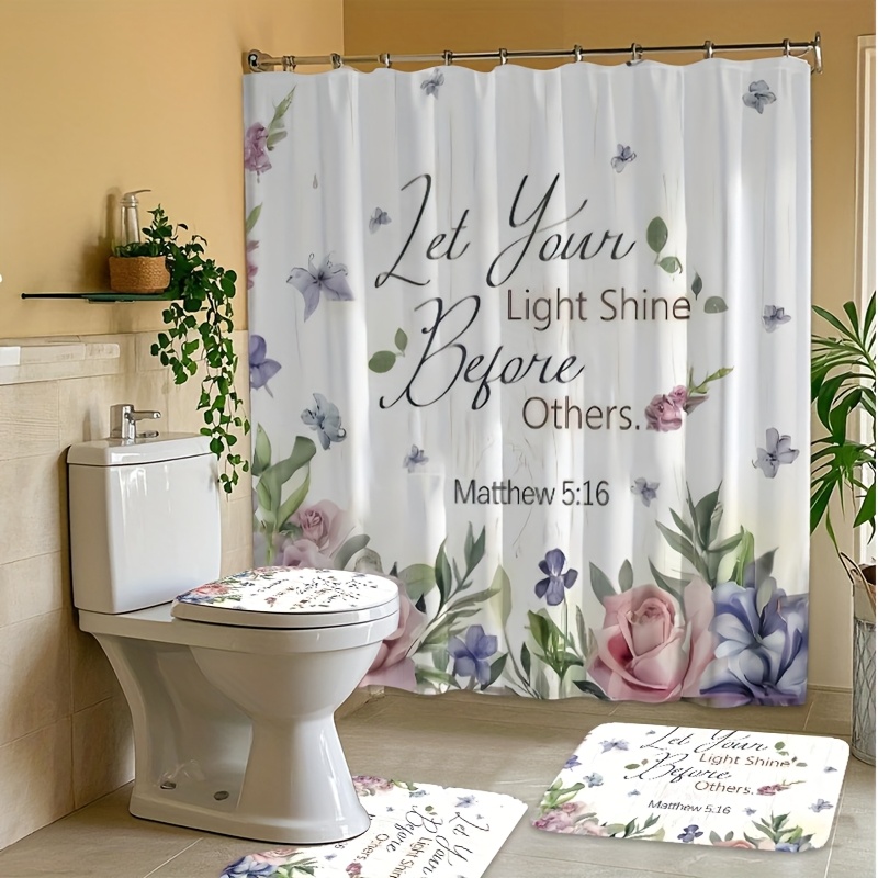 4pcs Set, Elegant Floral Bible-Themed Shower Curtain with 12 Hooks, Includes Bat