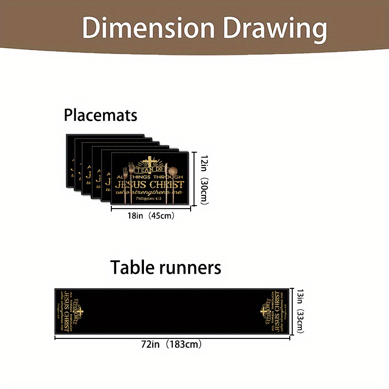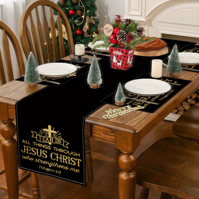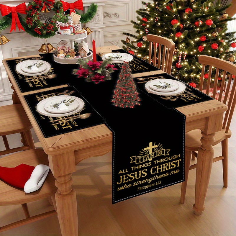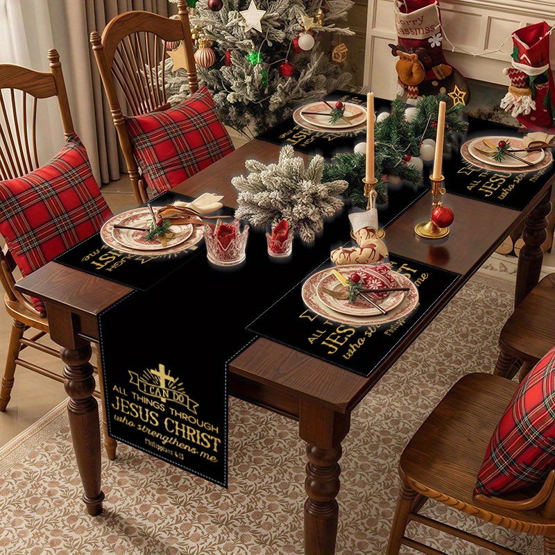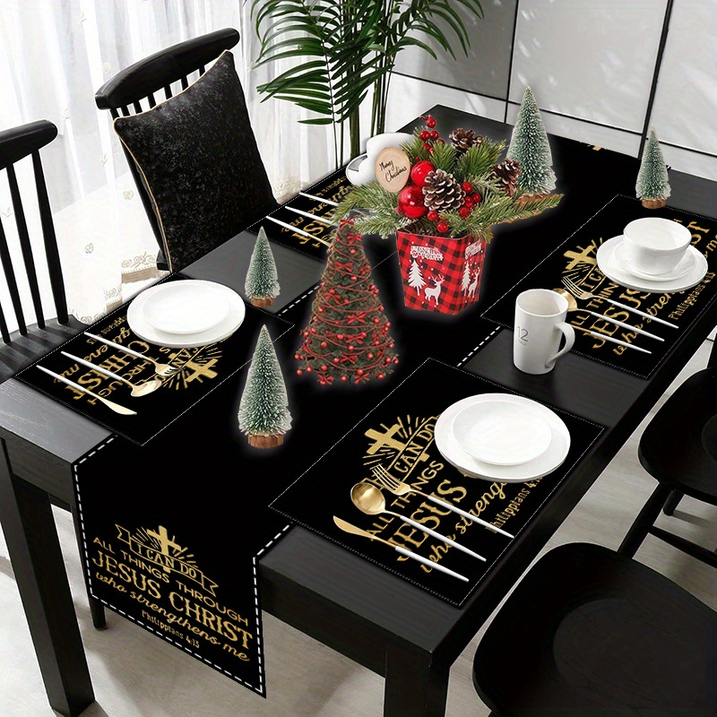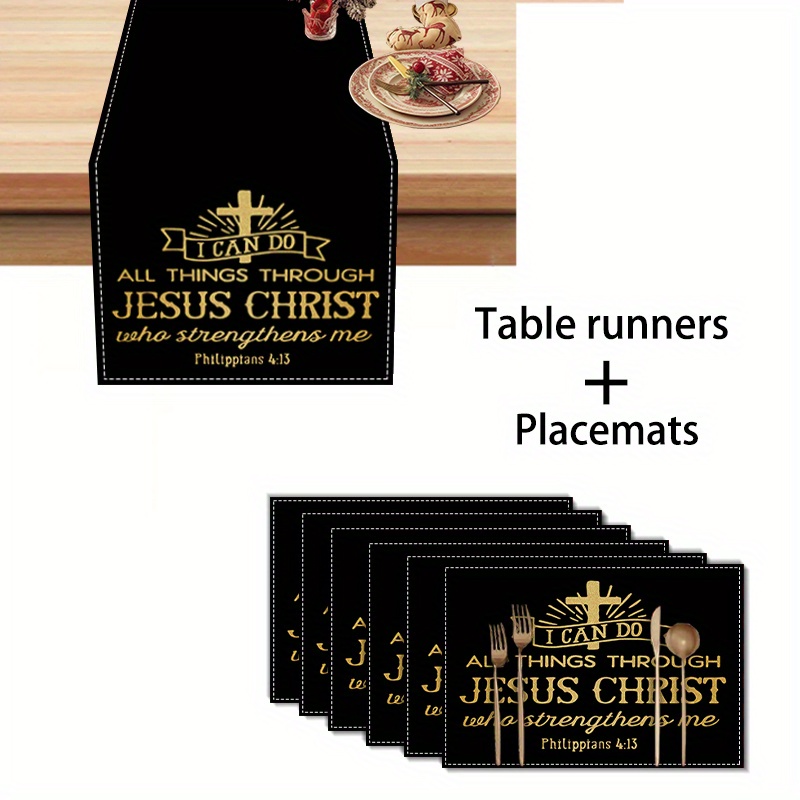 Black Table Runner and Placemats Set of 5/7pcs - Inspirational Christian Theme w